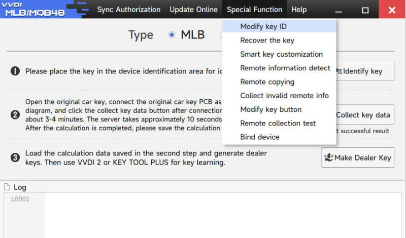 1.Use VVDI MLB Tool‘s Special Function > Modify key ID to assign a random ID to the blank key.